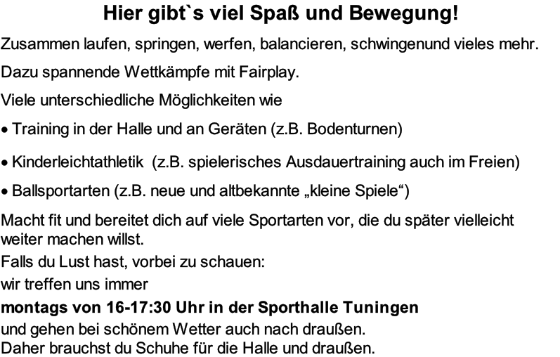 TG Tuningen Turngemeinde 1896 Tuningen e.V. UNSER VEREIN MITGLIED WERDEN IMPRESSUM DATENSCHUTZ Eure Trainerin ist Kerstin Krane